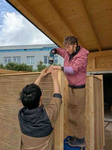 The program gathered students from 16 countries – including Mexico, China, Japan, Germany, France, and Austria – who worked side by side on solutions for climate-friendly, resource-efficient, and circular architecture. The workshops combined hands-on construction with theoretical input: from clay experiments and timber joinery to lectures by leading architects, engineers, and researchers.