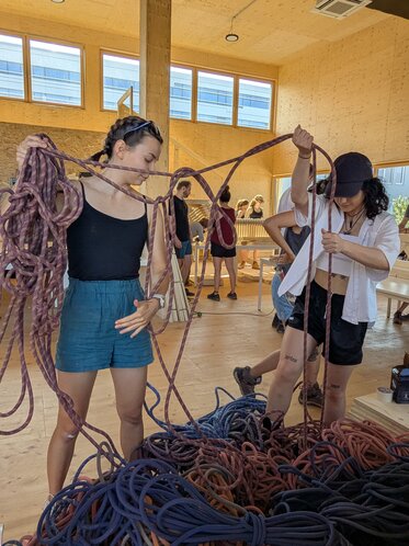 At the heart of sus^cool was the principle that sustainable building begins with saving resources. Clay excavated on-site was transformed into construction material, leftover wood was reimagined into functional seating, and even discarded climbing ropes found a new life in the designs.
