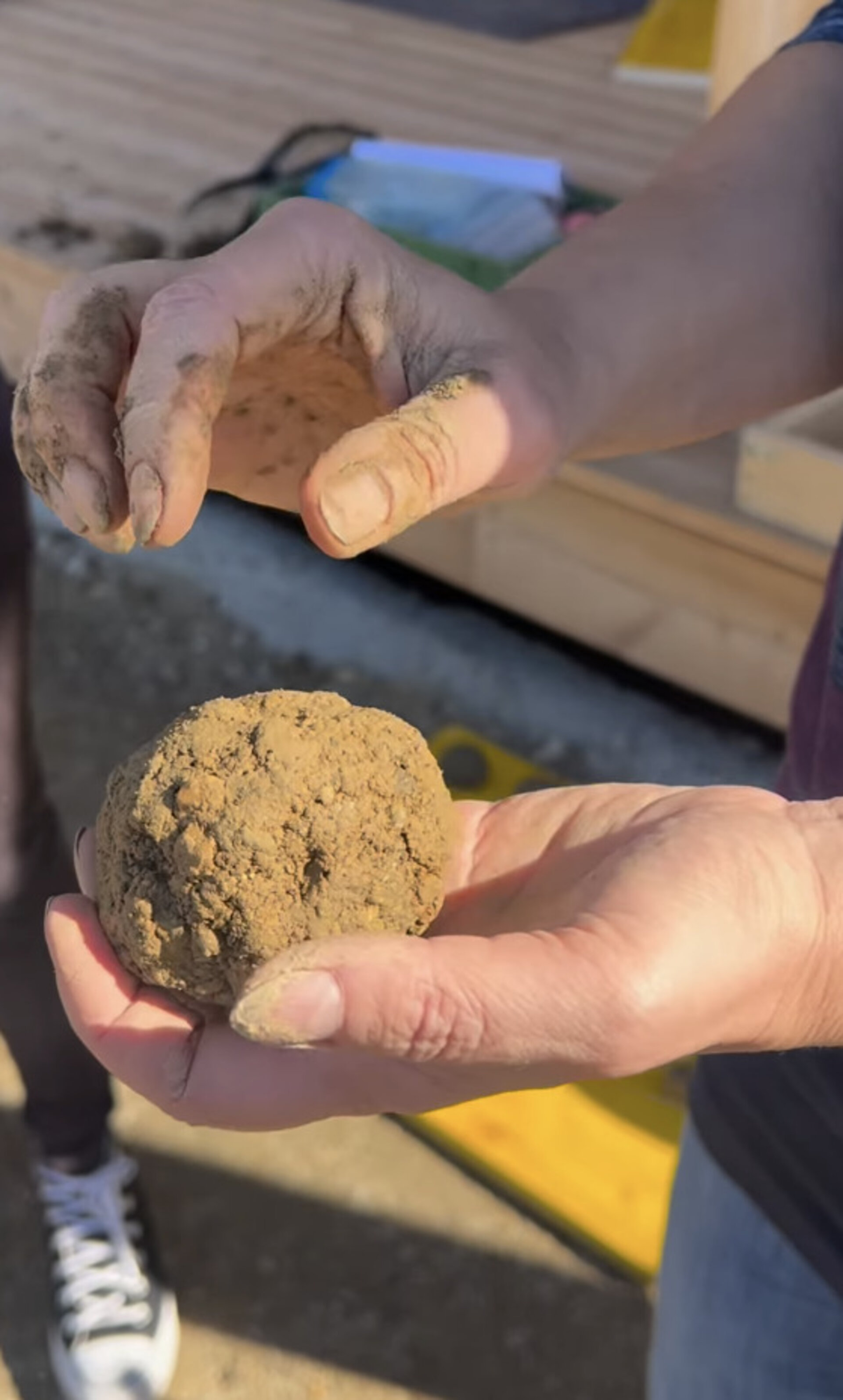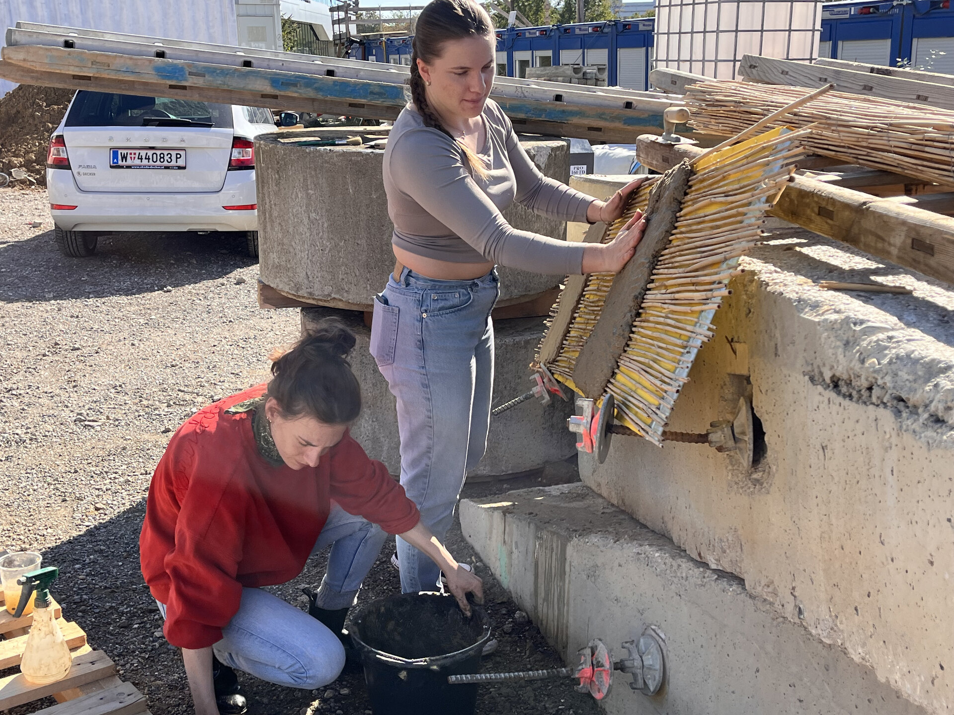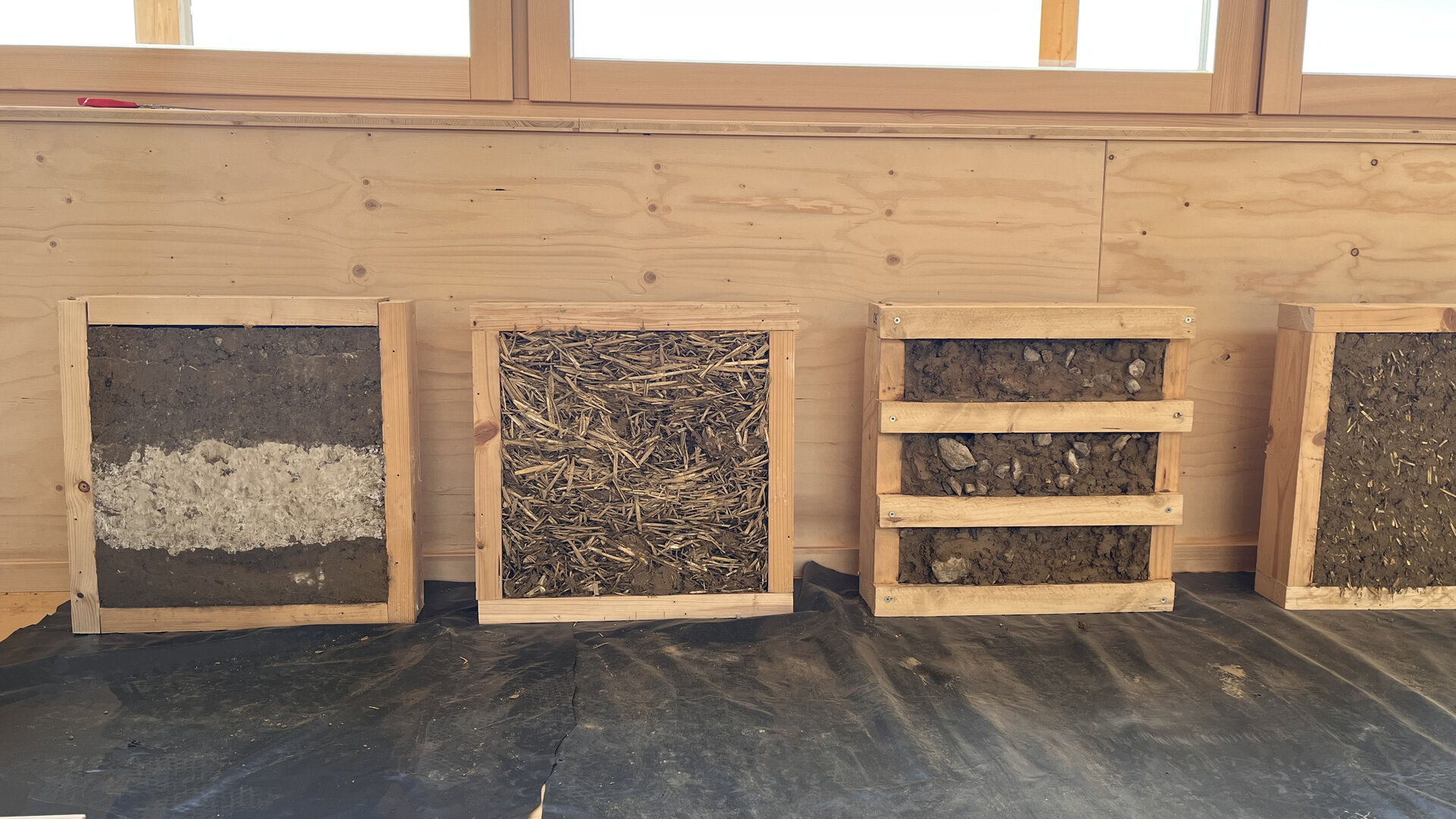 In October 2024, two earth building workshops took place for the first time in the Green Building Lab as part of the new lecture “Earth Building”. Students in the first semester of the Master’s degree in Architecture – Green Building had the opportunity to experiment with this fully recyclable material and try out various earth building techniques: Cob, rammed earth, earth bricks, wuzel masonry, earth wraps and earthen plasters. First, the students collected earth samples from almost every province in Austria. These were then tested comparatively with simple hand samples for their clay content and binding strength. The earth used for the sample components came directly from the site, namely from the excavation of the new HOHS building. The excavated earthen material was mixed with various aggregates (straw, sand, gravel, fibers, etc.) and various processing techniques were tried out. In a second workshop, the students developed various sample work pieces. To do this, they made frames from recycled wood (dismantling mock-up wet room) and filled them with various earth construction techniques. In addition to the beautiful result, which will be on display in a small exhibition in the Green Building Lab, working with earth is above all fun and demonstrates what is possible with a fully recyclable material.