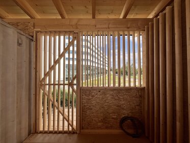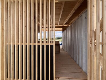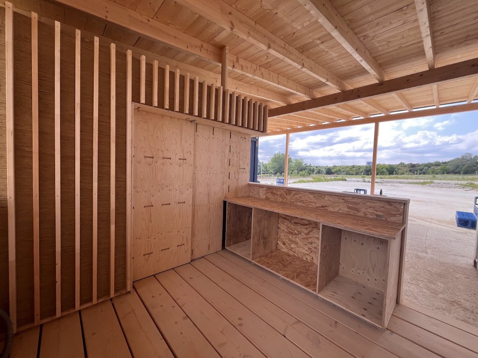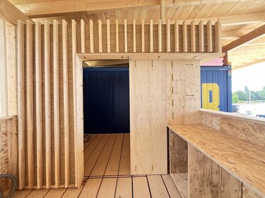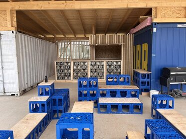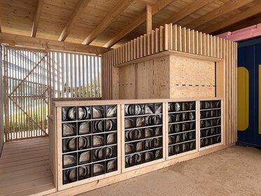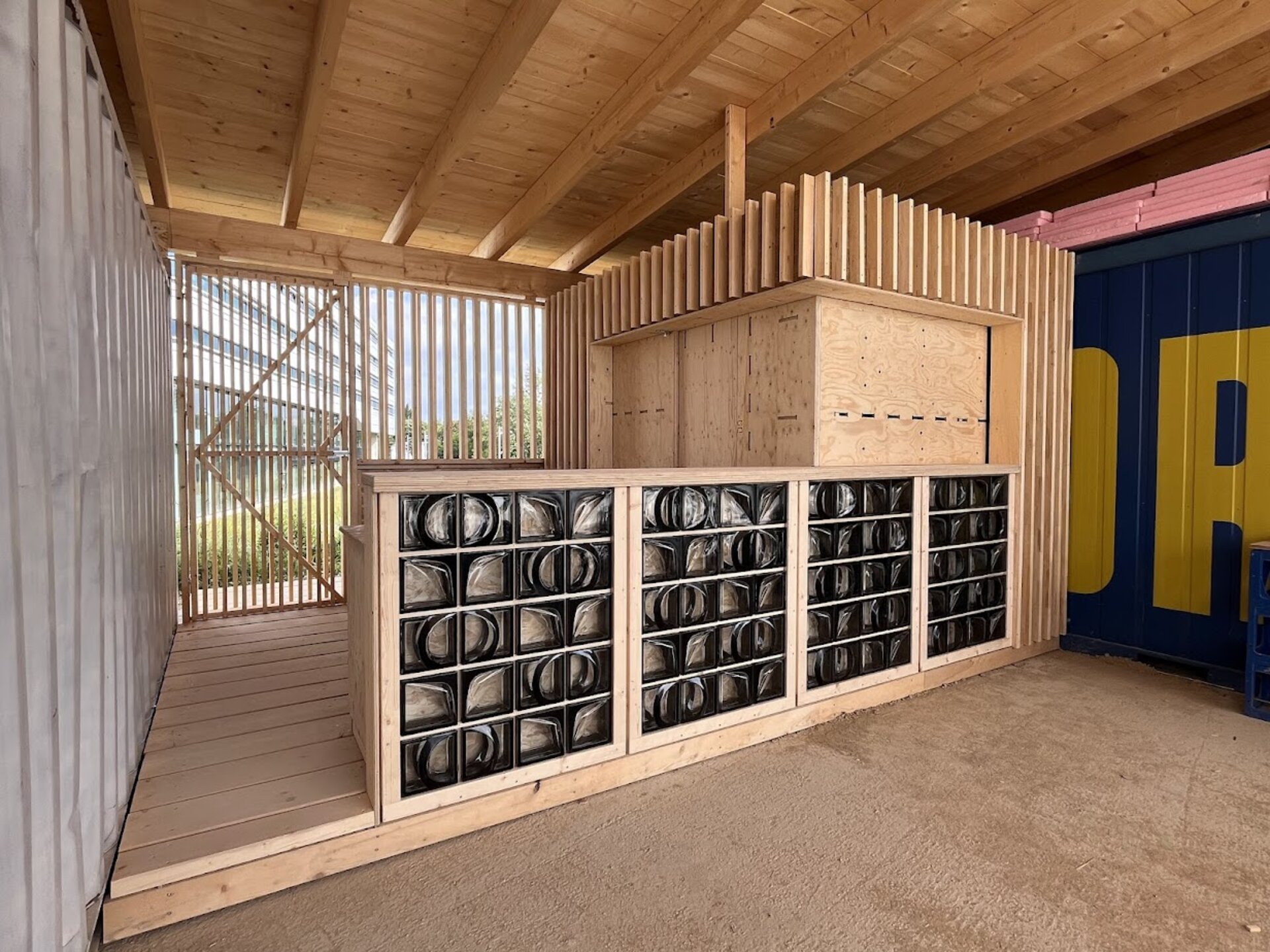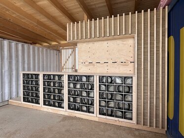 The brief was clear: to design and build a bar for the future sports ground, using as many recycled building materials as possible. Much of the material came from dismantled building components, the clay used was mixed directly from the on-site excavation, and the glass blocks – sourced via Willhaben – add a cool retro vibe and create a wonderfully moody bar atmosphere when lit.