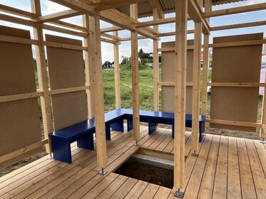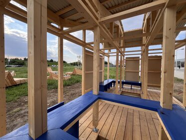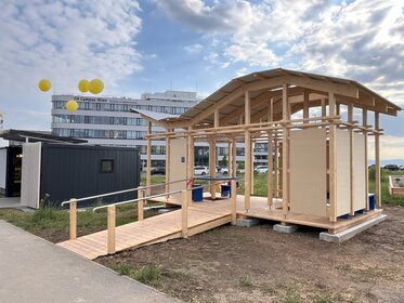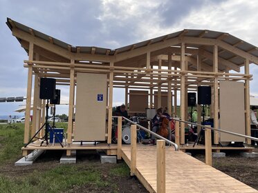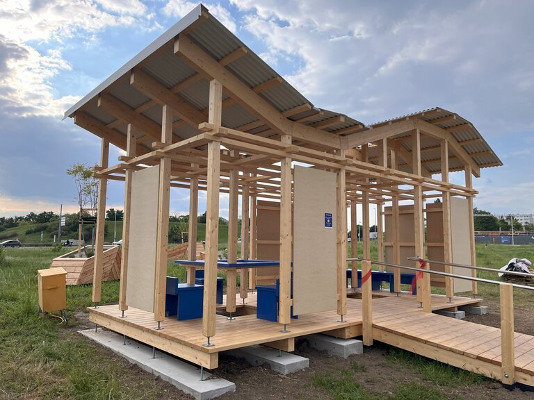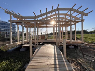 The pavilion is made of sustainable wood, is easy to assemble, and allows for modular use. A particularly remarkable feature is the integration of the surrounding green space—openings in the floor make it possible for grass to grow directly into the pavilion.