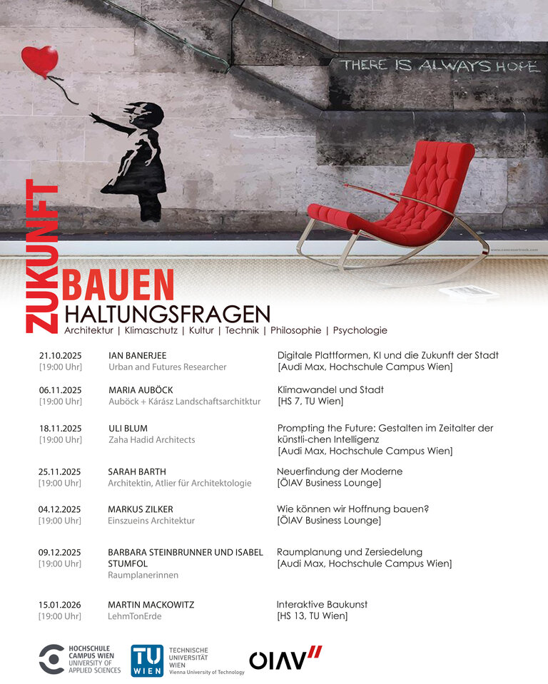 Architecture – Green Building at Hochschule Campus Wien (University of Applied Sciences) is organising a lecture series on “Future Building – Questions of Attitude” in cooperation with TU Wien (Faculty of Architecture and Planning) and the Austrian Association of Engineers and Architects (ÖIAV). The series invites speakers from architecture, spatial planning, building culture, cultural studies, climate action and technology to address the future and design of our (built) environment from multiple perspectives. It highlights different positions on how we should engage with our environment and places architecture and construction within a broader societal context.