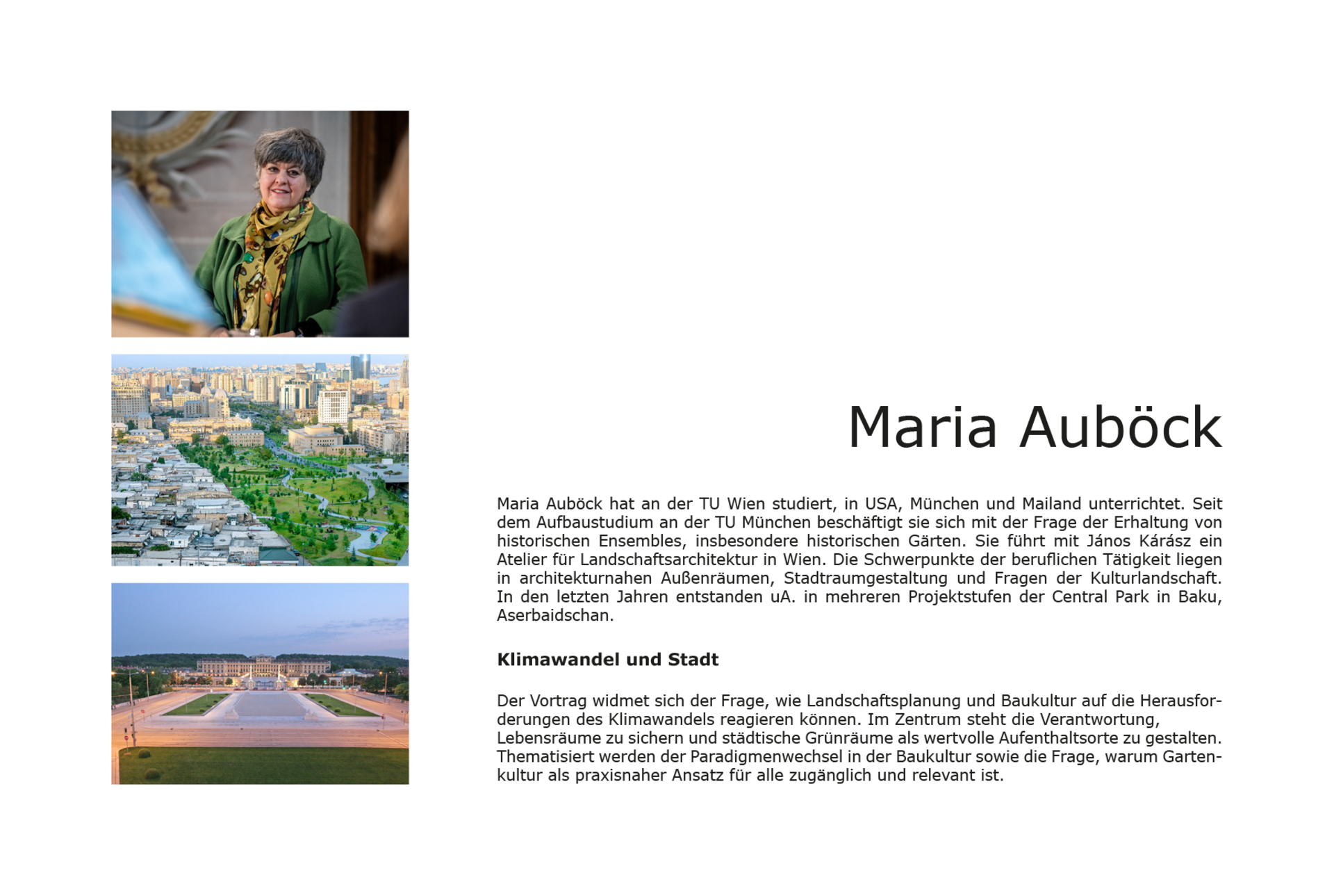 06.11.2025, 19:00: MARIA AUBÖCK– Klimawandel und Stadt (HS 7, TU Wien)